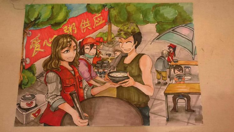 凌晨四点半,激动得一夜未眠的学生志愿者在薛剑锋老师的带领下来到郑州东风路“爱心粥屋”,与张薇老师一并先向爱心粥屋提供了米、面和油等物资,和一幅由美术系的马璐瑶同学连夜创作的关于“爱心粥屋”的漫画。该粥屋主要面向环卫工人、孤寡老人、流浪人员等群体,每天免费提供一顿爱心早餐。