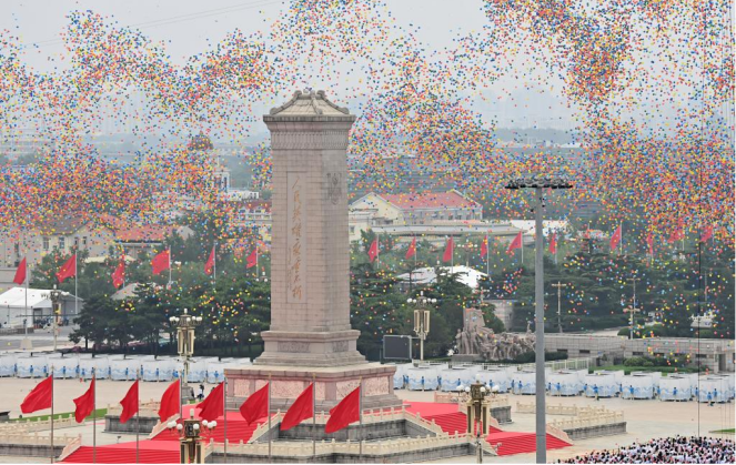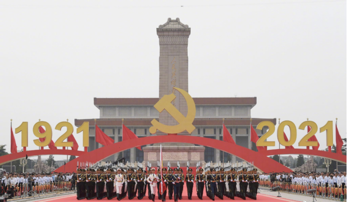 整齐划一的国旗护卫队踢出100步正步、训练有素的空军飞行梯队排成“100”的字样,还有响彻云霄的100响礼炮、天安门广场上无处不在的“100”,无不是对党最衷心的献礼。
