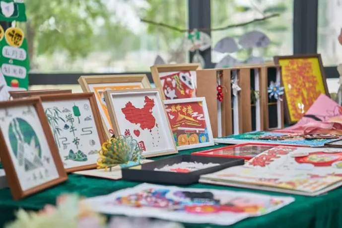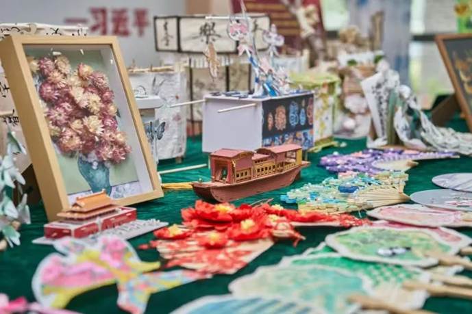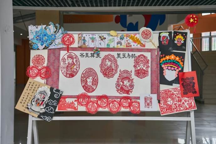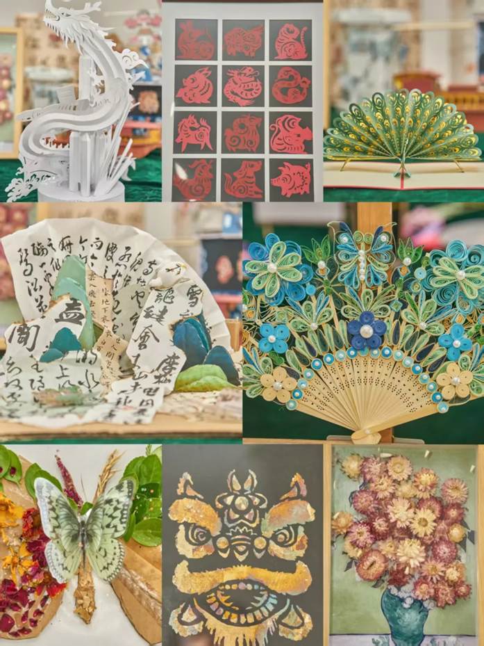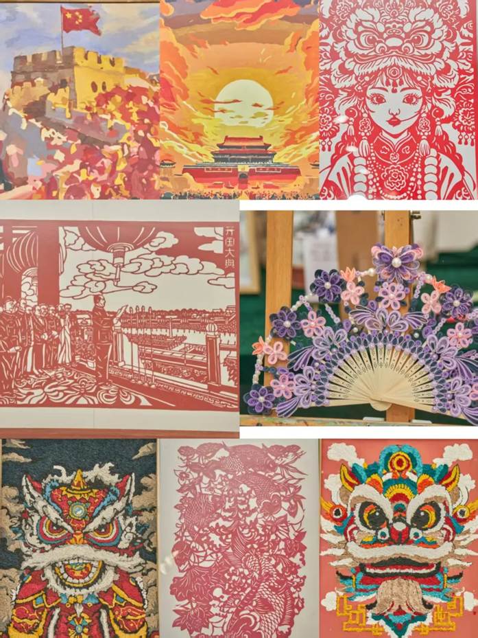 观展过程中,王利蕊对作品的设计理念、呈现形式和创作特色进行详细地介绍。她谈到,本次展览围绕课程第十章《建设社会主义文化强国》,包含“纸鸢裁春•灯火相传”“非遗薪火·守艺中国”“墨脉千年·画说时代”等系列主题,让学生根据专题知识,运用手工作品、微视频、绘画等具体形式进行创作,使文化认同深深扎根于学生心中。