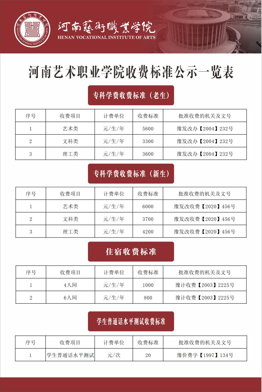 河南艺术职业学院收费标准公示一览表