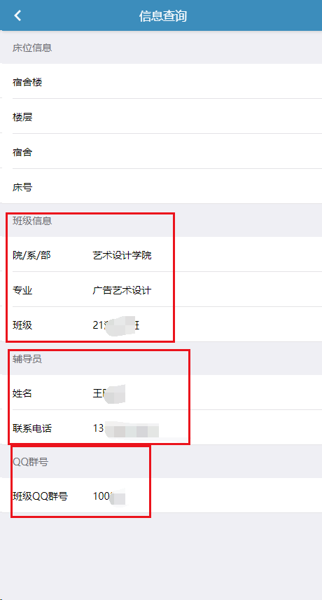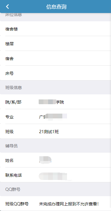 2.可以查询到自己的学院、专业、班级信息、辅导员信息、QQ群号等。如下图: |
