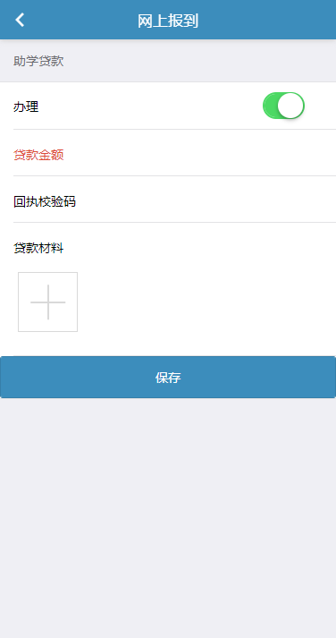 5.助学贷款,若无需办理,直接点击保存;如果需要办理,则按照助学贷款页面中的内容进行填写和上传附件。如下图: |