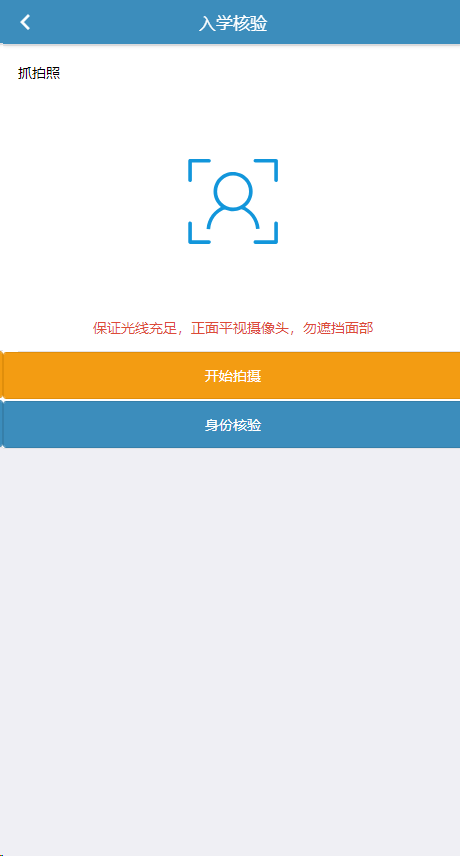 3.保存后返回,点击身份核验;点击“开始拍摄”,抓取人像,然后点击“身份核验”,如下图(左);提示操作成功,稍后可在“身份核验结果”中查看核验结果,如下图(右)。核验失败则须重新上传身份证照片和抓拍人像进行比对。若多次失败则须联系辅导员进行报备,开学后到校进行线下核验。 |