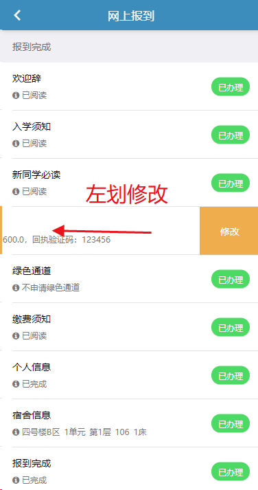 8.如果环节信息填写错误,可在报到完成后,左滑对应环节进行修改。如下图: |