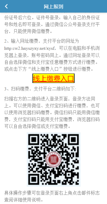 7.在线缴费。阅读在线缴费须知,扫描二维码缴费或点击“线上缴费入口”按钮缴费。如下图: |