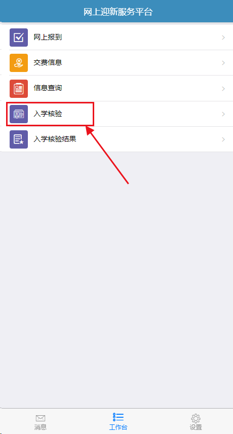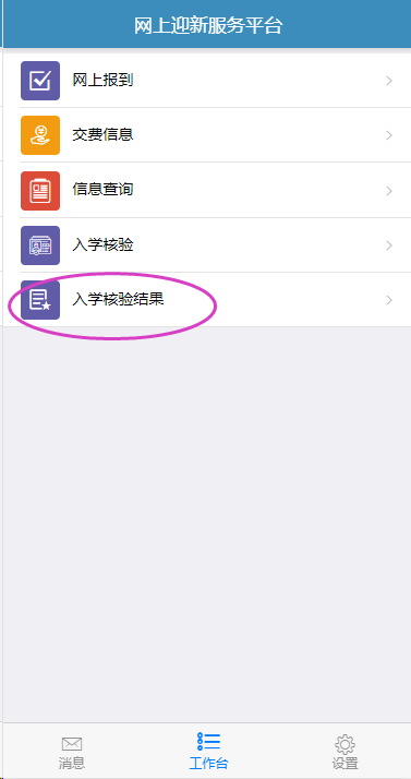 2.在平台中,可进行网上报到和入学核验,信息查询、交费信息,如下图: |