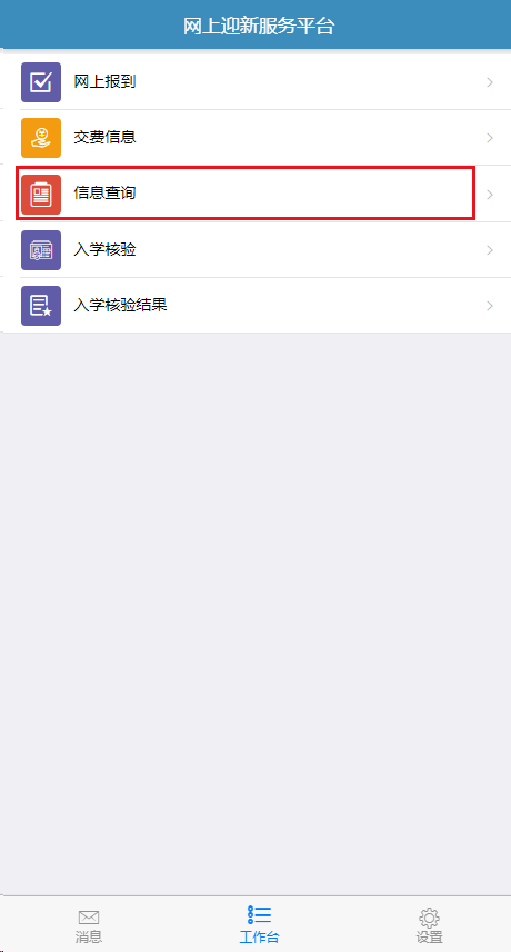 1.在网上迎新服务平台首页,点击“信息查询”,如下图: |
