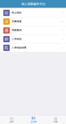 1.登录平台后,可进行网上报到和入学核验,信息查询、交费信息,如下图: |