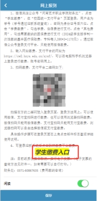 点击公众号内下方菜单“网上迎新”,输入账号密码进行登录并绑定微信。“绑定微信”后的按钮右划,变为绿色后点击“保存”,点击保存即可完成微信绑定(绑定后下次登录无需输入账号密码)。