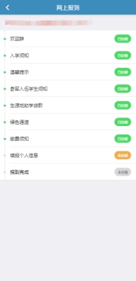 2.网上报到自“欢迎辞”开始,按顺序提示进行填写,完成后显示各环节办理状态,如下图: |