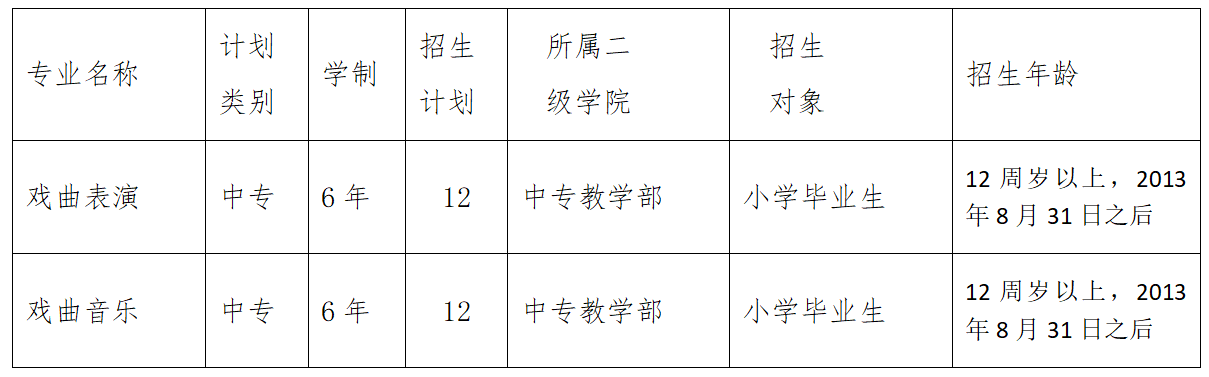 3.戏曲表演专业招收:男生8人,女生4人;戏曲音乐专业招收:板胡1人、琵琶1人、古筝1人、打击乐5人、唢呐(笙)4人。对确有专业基础的优秀生源放宽年龄限制。