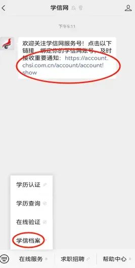 第一步:手机微信搜索并关注“学信网”公众号,点击推送消息中的链接网址或左下方【学信档案】模块,进入【注册学信网账号】页面。